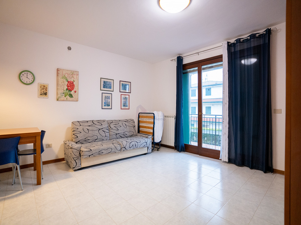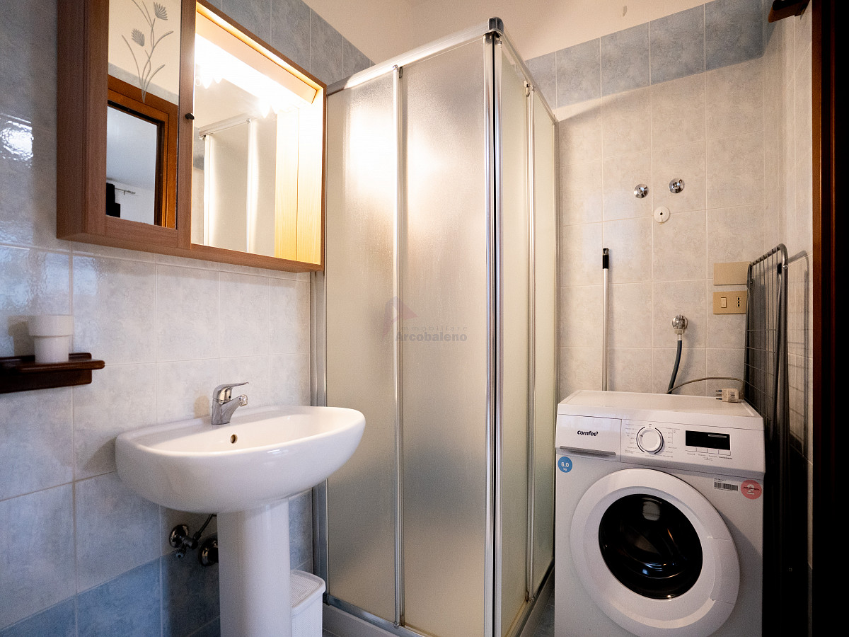 Zona giorno con angolo cottura, bagno finestrato con box doccia e terrazzo abitabile.